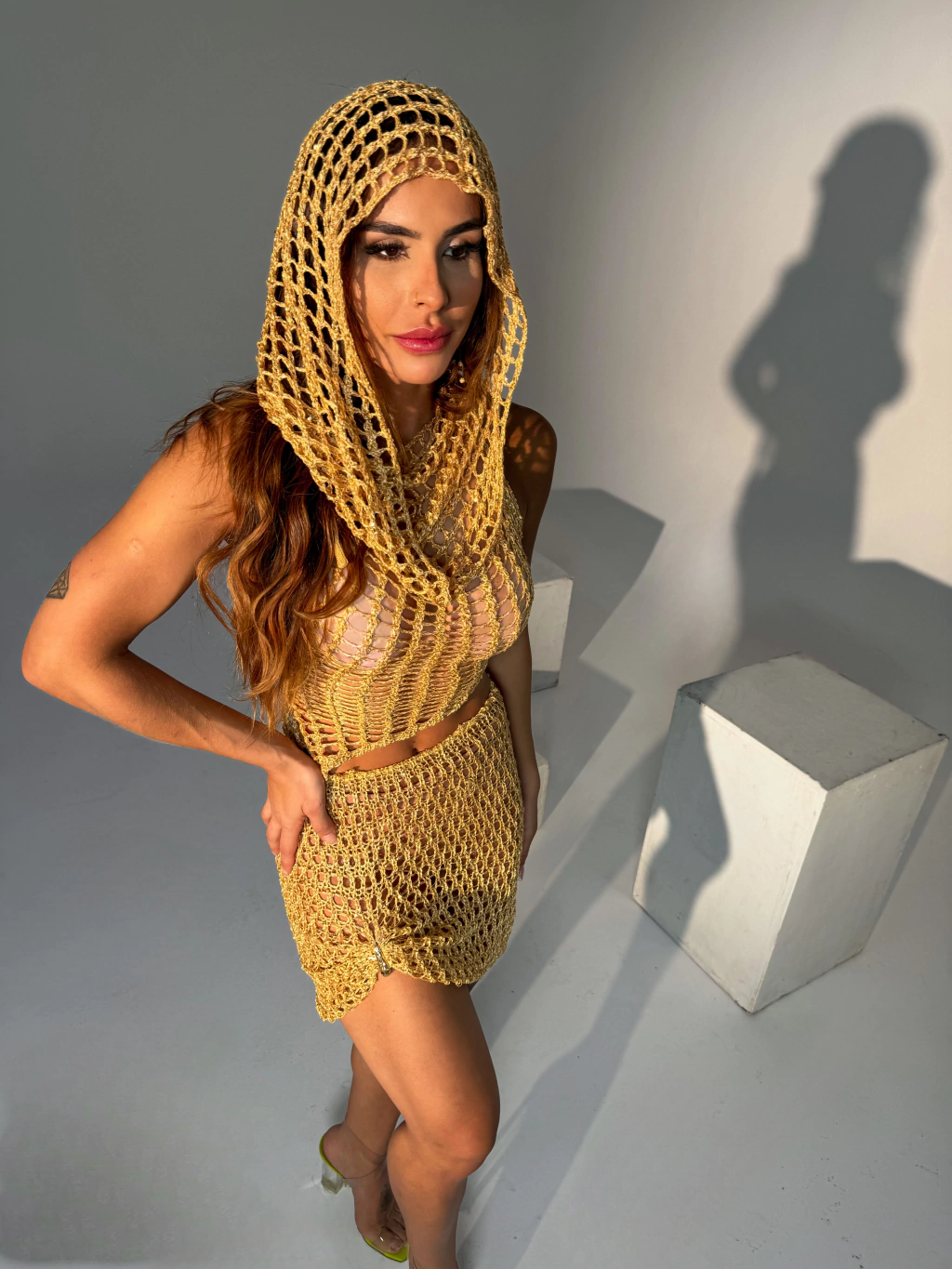 sendo elas : saia , cropped frente única e o capuz que também pode ser usado como